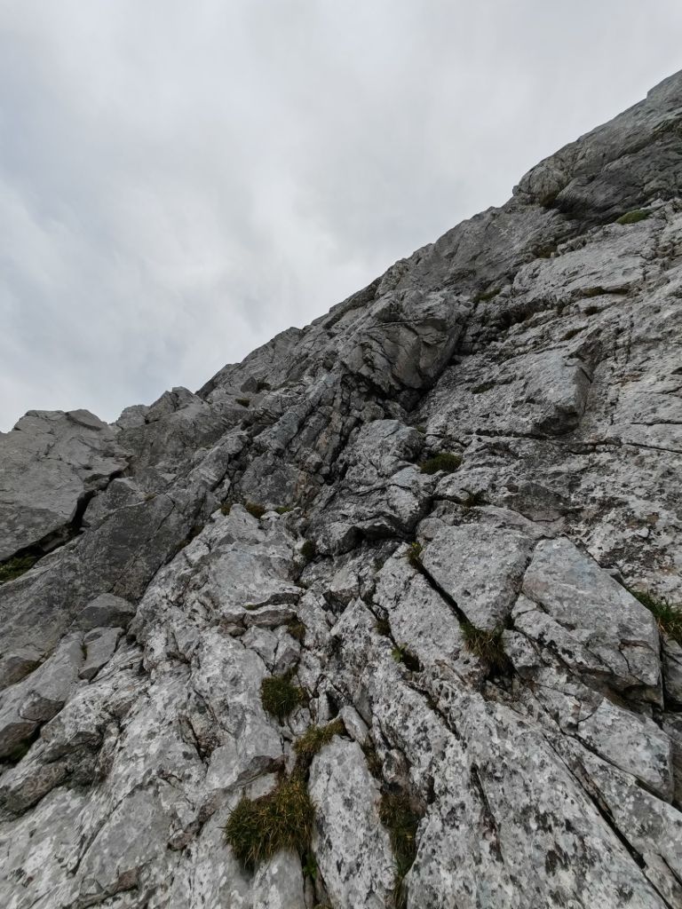 - Salire dritti sopra la sosta qualche metro e poi affrontare un muro di roccia nera lavorata inizialmente dritti e poi leggermente a sinistra prendendo una fessura per poi tornare dritti. Arrivati sotto al tettino non seguire gli spit dritti ma spostarsi leggermente a sinistra. Continuare poi per terreno più facile fino alla sosta su due fix su comoda cengia erbosa. [6a, 30m]