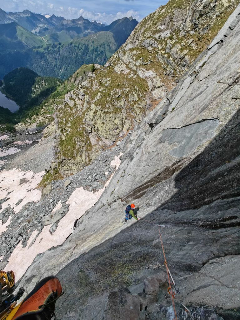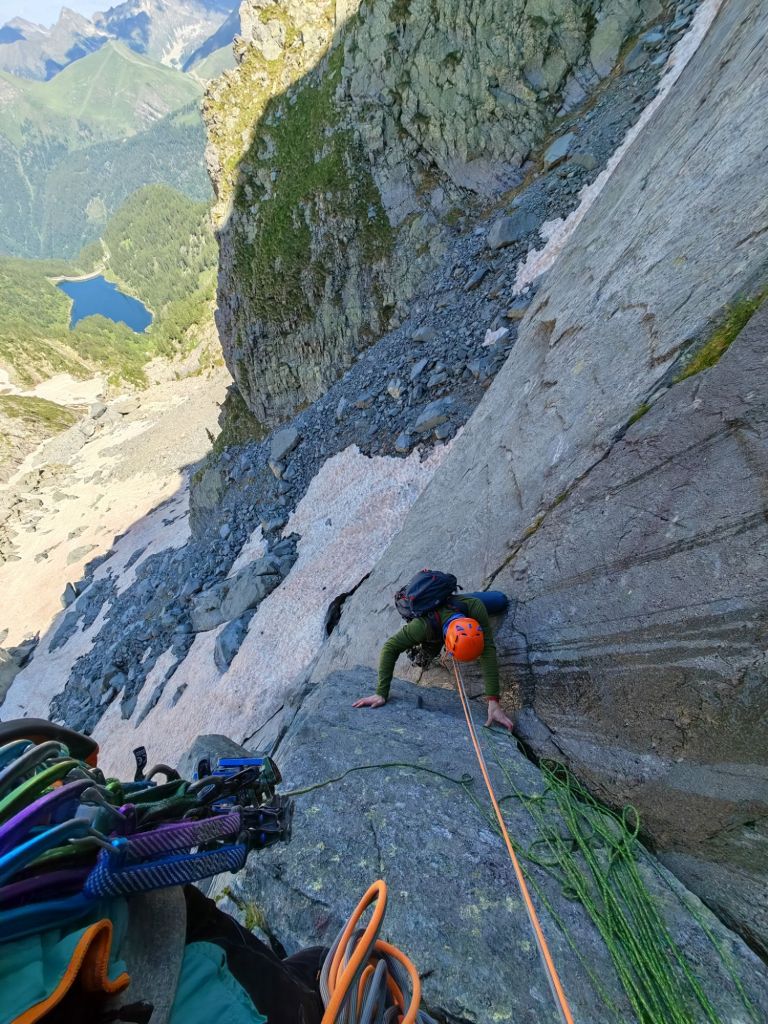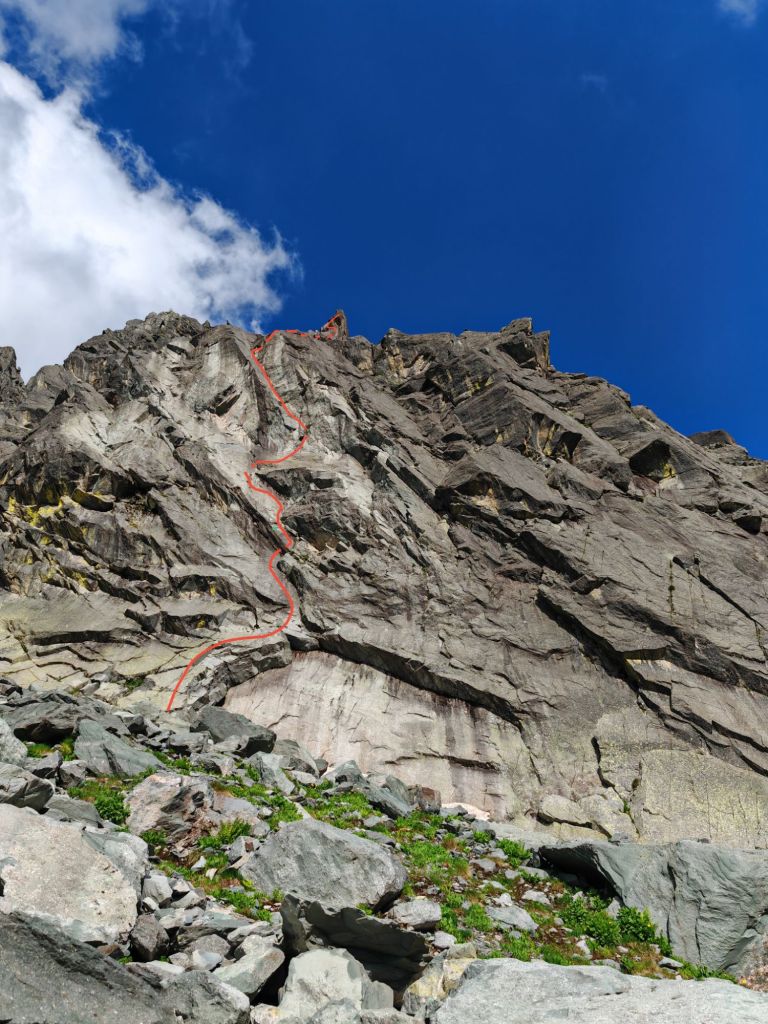 In tre giornate sparse fra fine giugno e luglio 2024 ho chiodato insieme a degli amici questa nuova via dedicata a Luca Bernini, un grande amico portato via da una caduta fatale mentre sciavamo insieme sulla est del Cervino inseguendo un sogno. La scelta del Vallone di Sardegnana e la ovest dei Corni può sembrare strana vista la quasi nulla frequentazione del posto ma ho deciso di dedicargli una via proprio qui per due motivi. Sicuramente un itinerario con avvicinamento troppo plaisir non sarebbe stato nello “stile” di Luca e in secondo luogo entrambi eravamo molto legati a questo posto dove già avevamo salito una nuova linea insieme l’inverno scorso in una delle giornate in montagna più belle e spontanee che io ricordi. L’avvicinamento al Vallone non è certo adatto a tutti ma chi avrà voglia di farsi una bella camminata prima di scalare sicuramente non se ne pentirà trovandosi in un ambiente davvero selvaggio dove spesso non si incontra nessuno per tutta la giornata senza dimenticarsi poi dell’ottima qualità della roccia!