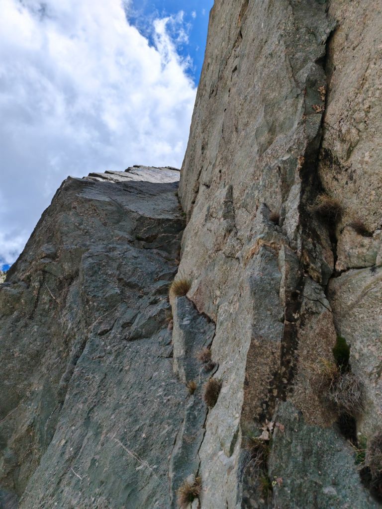 - Salire il diedro sopra la sosta con passi tecnici per poi uscire in placca verso destra. Continuare sulla placca ora facile e appoggiata salendo sempre abbastanza dritti fino alla grossa cengia. Continuare sulla cengia leggermente verso sinistra puntando a un grosso fessurone/camino alla cui base si sosta (2fix). [6c+/6a e A0, 55m]