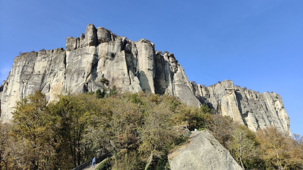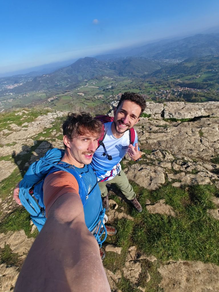 Logica e bella salita che sale dei fessuroni/lame che quasi ininterrotti portano in cima alla pietra superando anche i repuslivi strapiombi finali. La chiodatura è a resinati posizionati bene e nel posto giusto, solo sul secondo tiro sono un po’ più lontani e si sente un po’ di ingaggio. Per me è la prima volta alla pietra e devo dire che mi ha colpito, arrampicare su una parete con il suono dei trattori e le motoseghe nell’aria con lo sfondo dell’appennino fa un certo effetto. La roccia beh è arenaria quindi richiede un minimo di attenzione e qualche scaglia che si stacca bisogna metterla in conto ma dopo un paio di tiri ci si abitua.