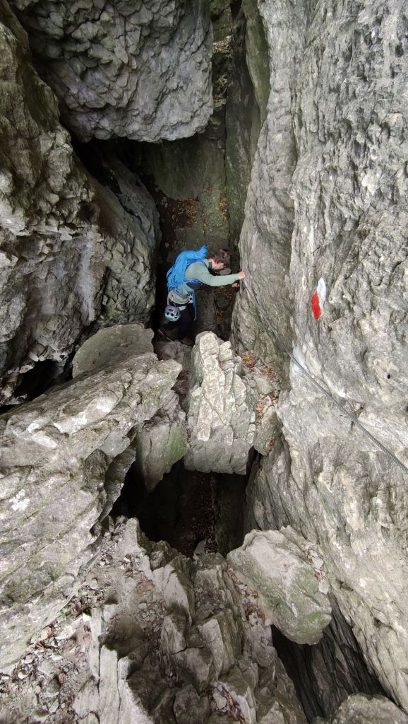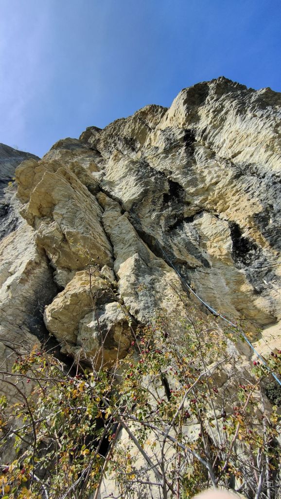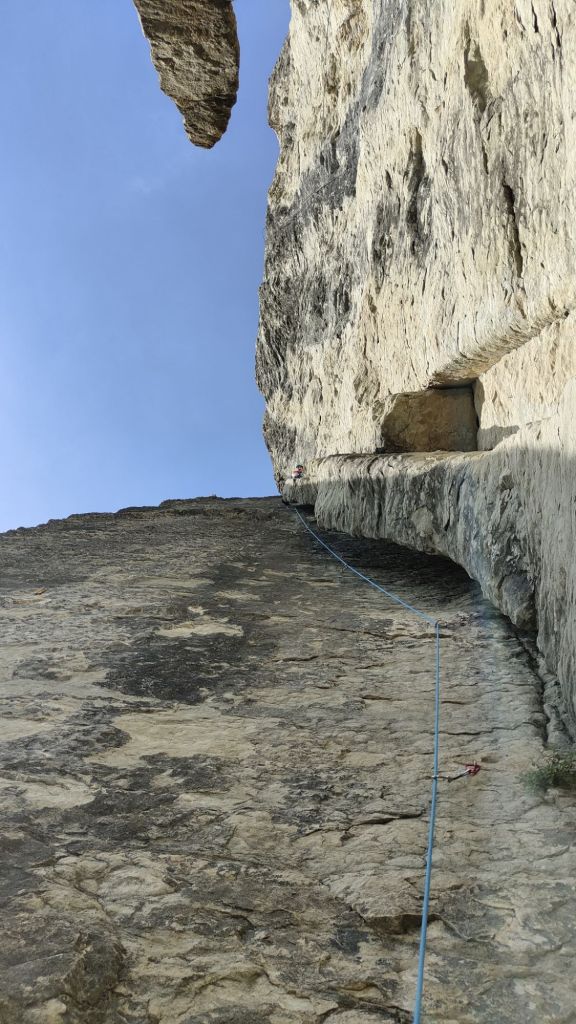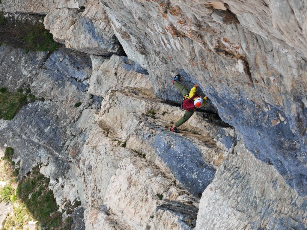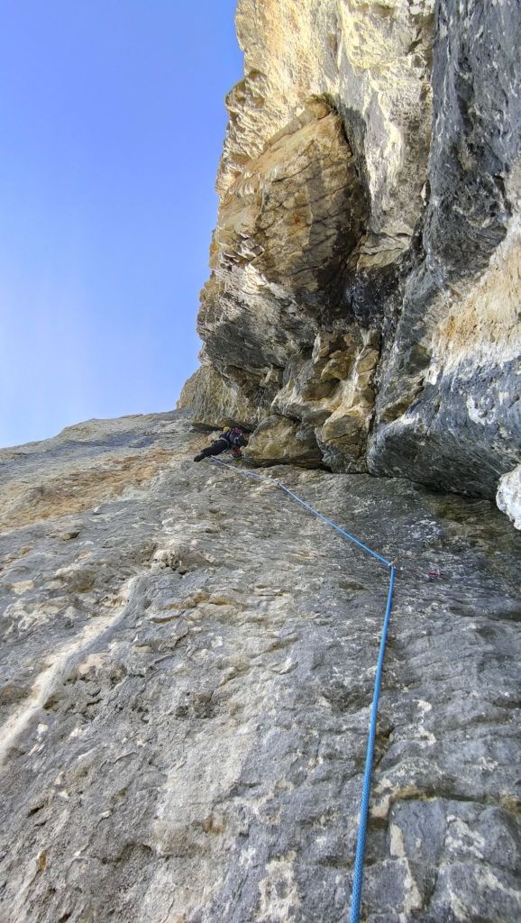 - Rientrare a destra nel diedro e seguire le lame/fessure verso sinistra superando due rigonfiamenti con passi un po’ rudi. Si sosta sul bordo dello spigolo a sinistra in massima esposizione. [VII, 30m]