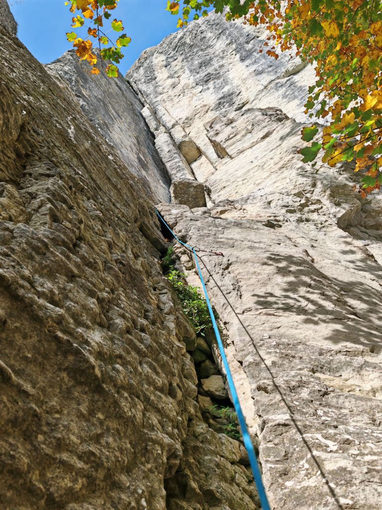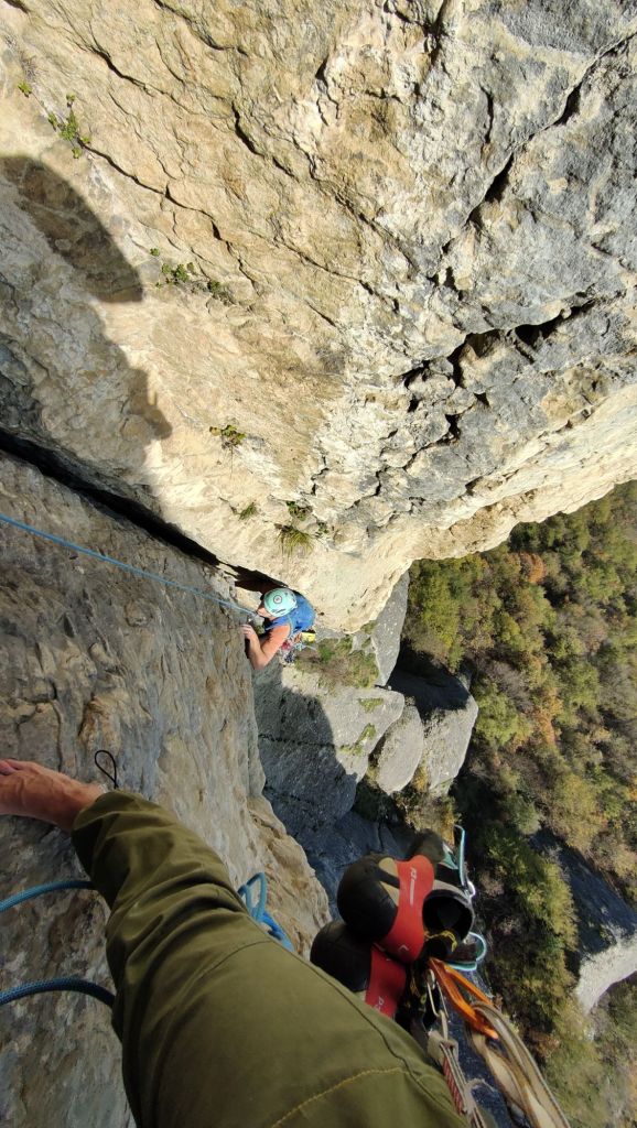 - Salire la fessura fuori misura per intero fino alla sua fine dove si sosta qualche metro dopo essere usciti dal diedro. Attenzione a rinviare solo i resinati e non gli spit vecchi che sono ancora presenti altrimenti si rischia di finire i rinvii. [40m, VII obbl.]