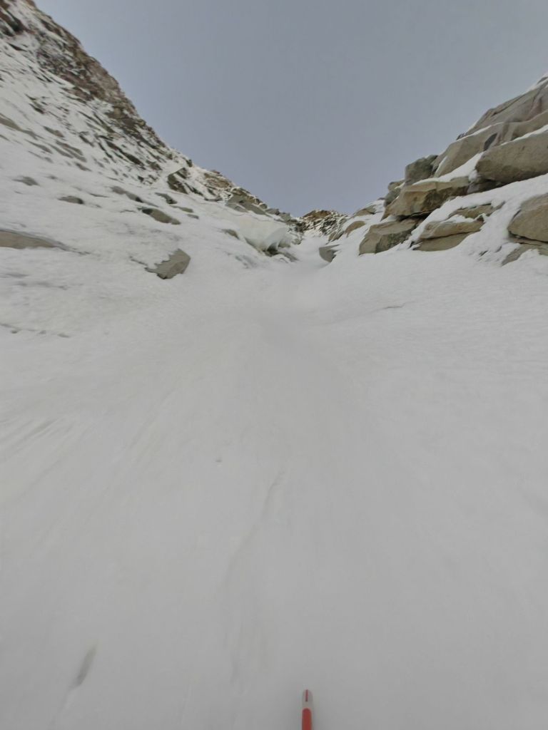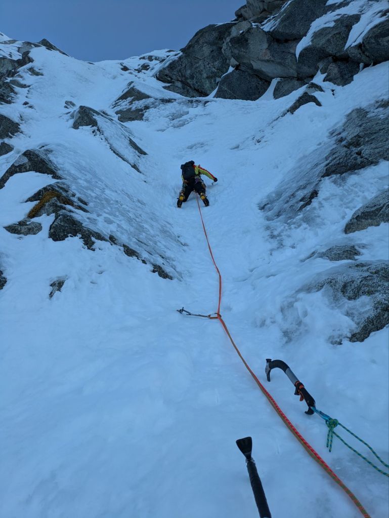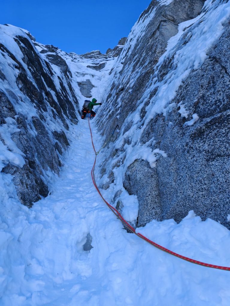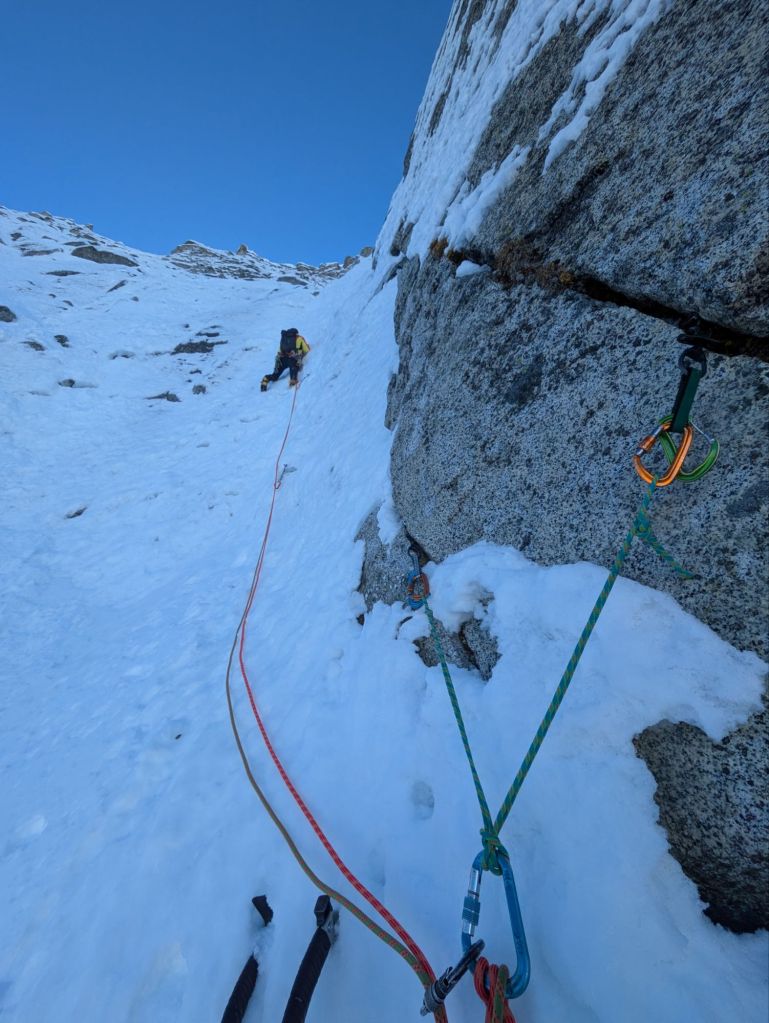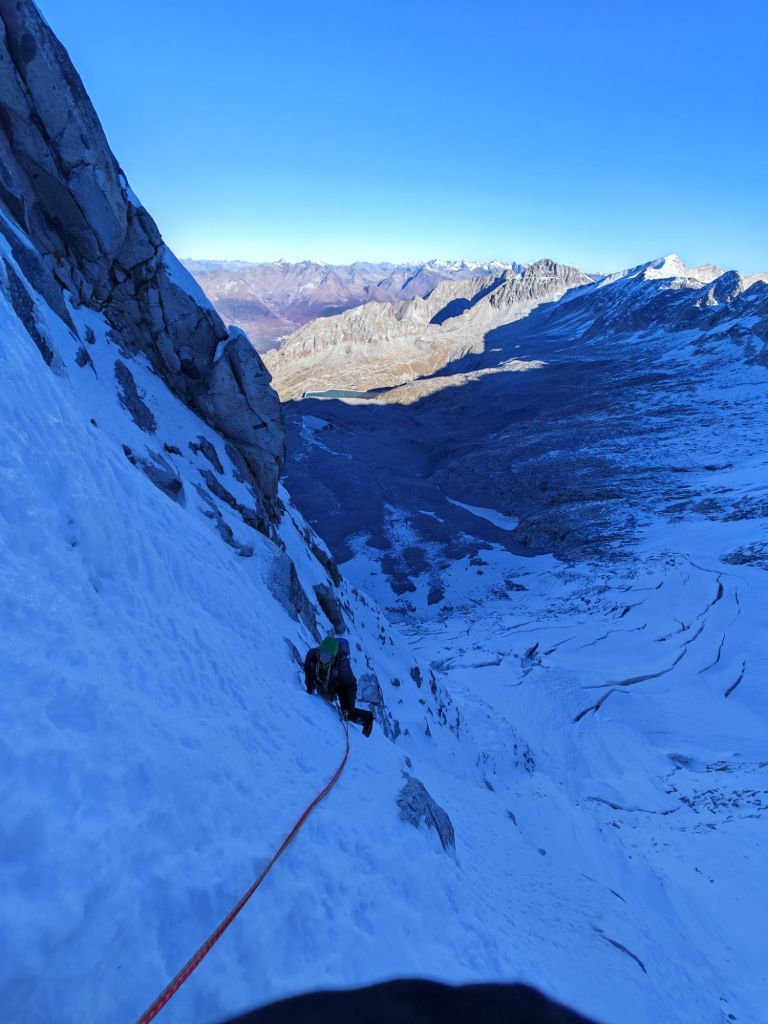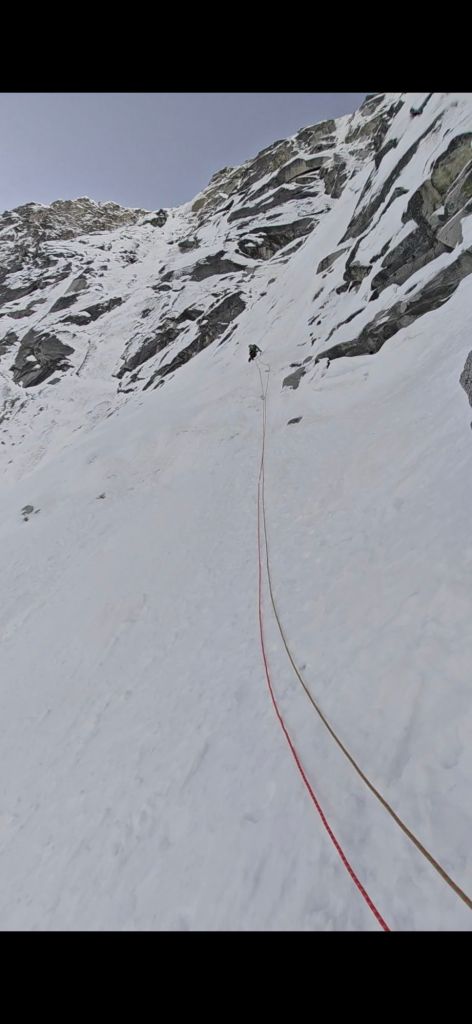 - Abbiamo fatto un lungo tiro in conserva di circa 100/120m (si mette un buon Friend a fine corda sul lato destro del canale). Sosta su masso sulla destra in una evidente zona più appoggiata. [Neve con alcuni salti ripidi]