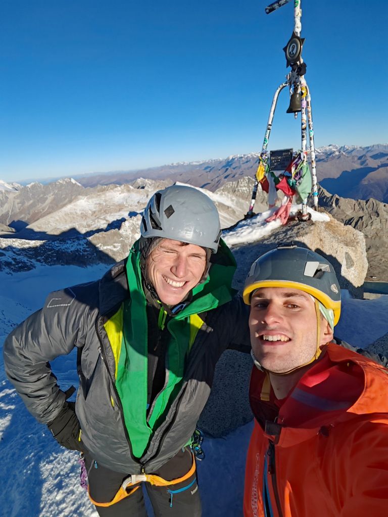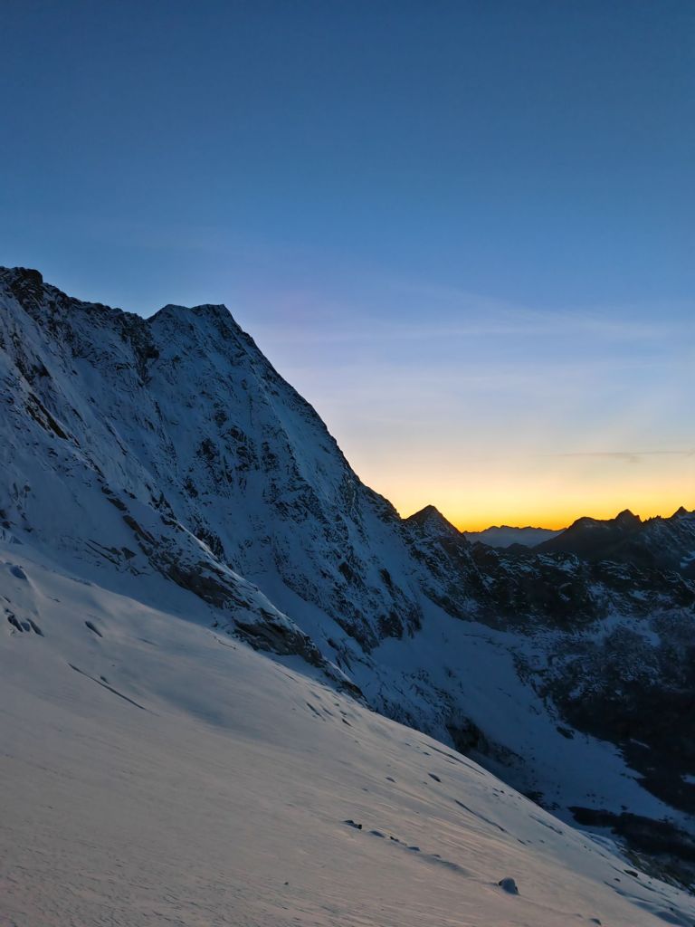 Discesa: Dalla vetta verso sinistra fino ad un salto che si aggira verso sinistra prendendo una ripida ed esposta cresta che si scende fino al ghiacciaio sottostante. Continuare verso sinistra (est) lungamente senza perdere troppa quota per poi risalire brevemente al Colle degli inglesi dove con 3 calate si giunge sul ghiacciaio del Veneroccolo (Attenzione ultima calata da 60 m). Da qui si traversa verso nord per fino a quando non conviene scendere verso ovest per poi ricongiungersi alla morena seguita durante l’avvicinamento per la parete. Da qui a ritroso.