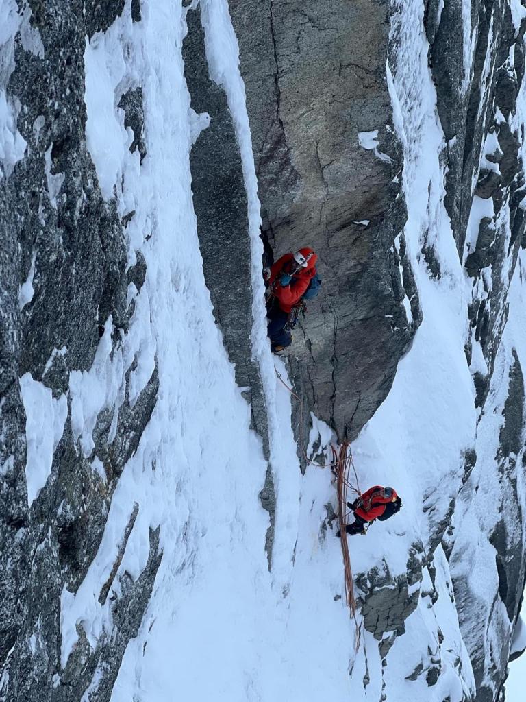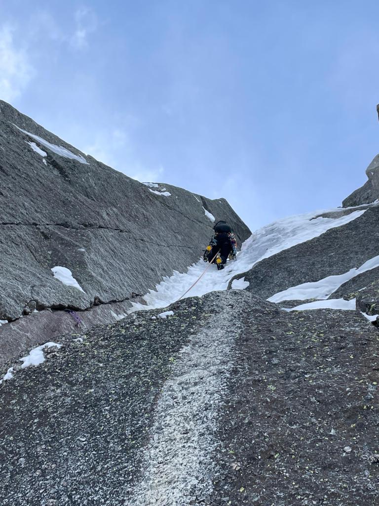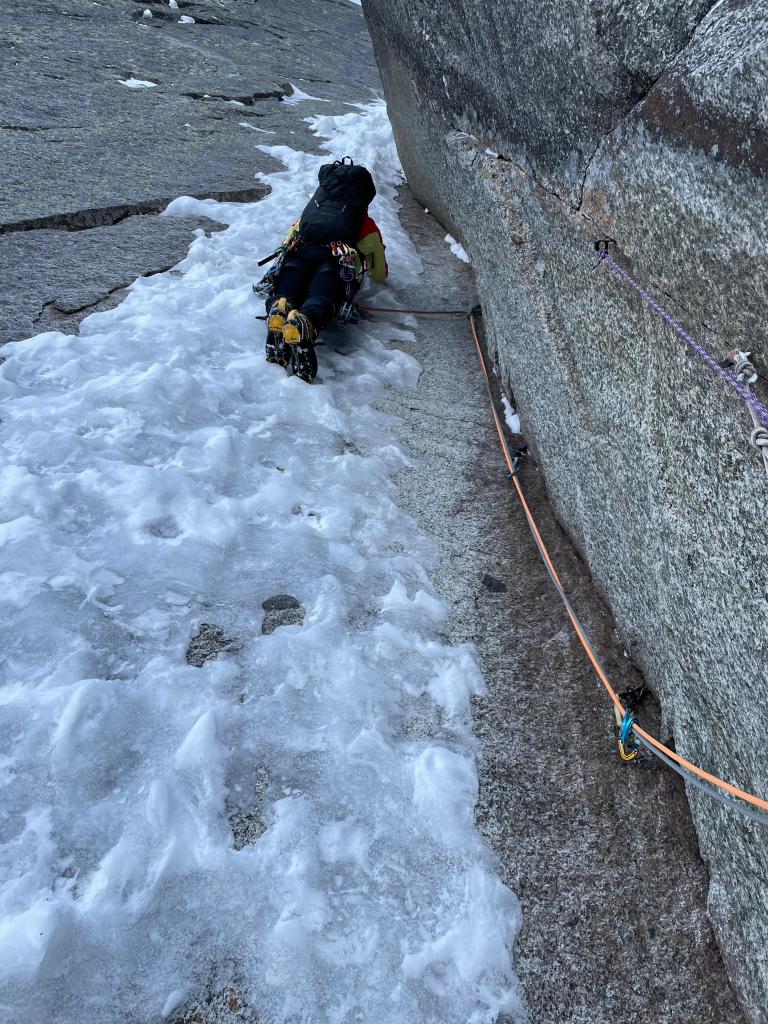 Una via che sicuramente non ha bisogno di presentazioni e che rimane ancora un “benchmark” dell’arrampicata mista. Una linea perfetta che insegue delle esili placche di neve/ghiaccio incollate alla roccia liscia che permettono una delicata progressione verso l’alto. Solitamente gli ultimi tiri non si formano e si esce sulla vicina “Rebuffat”, noi siamo stati fortunati e abbiamo trovato buone condizioni anche sull’uscita originale che si è fatta scalare senza troppi problemi. Nelle condizioni da noi trovate la difficoltà penso si possa collocare più o meno sull’ M6 con molti tratti “facili” poco o per nulla proteggibili.