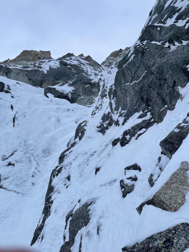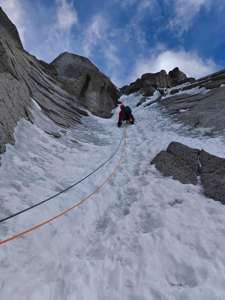 - Spostarsi a destra ed entrare in un sistema di goulotte che si seguono fino a quando diventano pendio nevoso e poi nuovamente più verticale su neve dura si sosta a sinistra sulla roccia con due chiodi e nut (abbiamo saltato una sosta intermedia facendo conserva circa 100m).