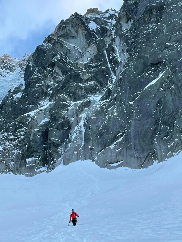 Attacco: Da Chamonix raggiungere il parcheggio del secondo tornante che porta al traforo del Monte Bianco seguire il sentiero per il Rifugio Plan de L’aguille che in circa 2/3 ore porta al rifugio. È presente un locale invernale con circa 10 posti letto e delle coperte. Dal Rifugio si prosegue puntando alla stazione intermedia della funivia della Midi dalla quale poi si inizia a traversare a sinistra stando sotto un laghetto. Si guadagna una grossa morena e la si segue lungamente verso sud fino a quando non conviene scendere brevemente a sinistra per prendere la base del grosso pendio che scende dalla parete dove attacca la via. Si sale faticosamente il pendio nevoso fino all’attacco posto appena a sinistra di un costone roccioso su di una colata di neve. [2/3:30 ore a seconda dell’innevamento/traccia]