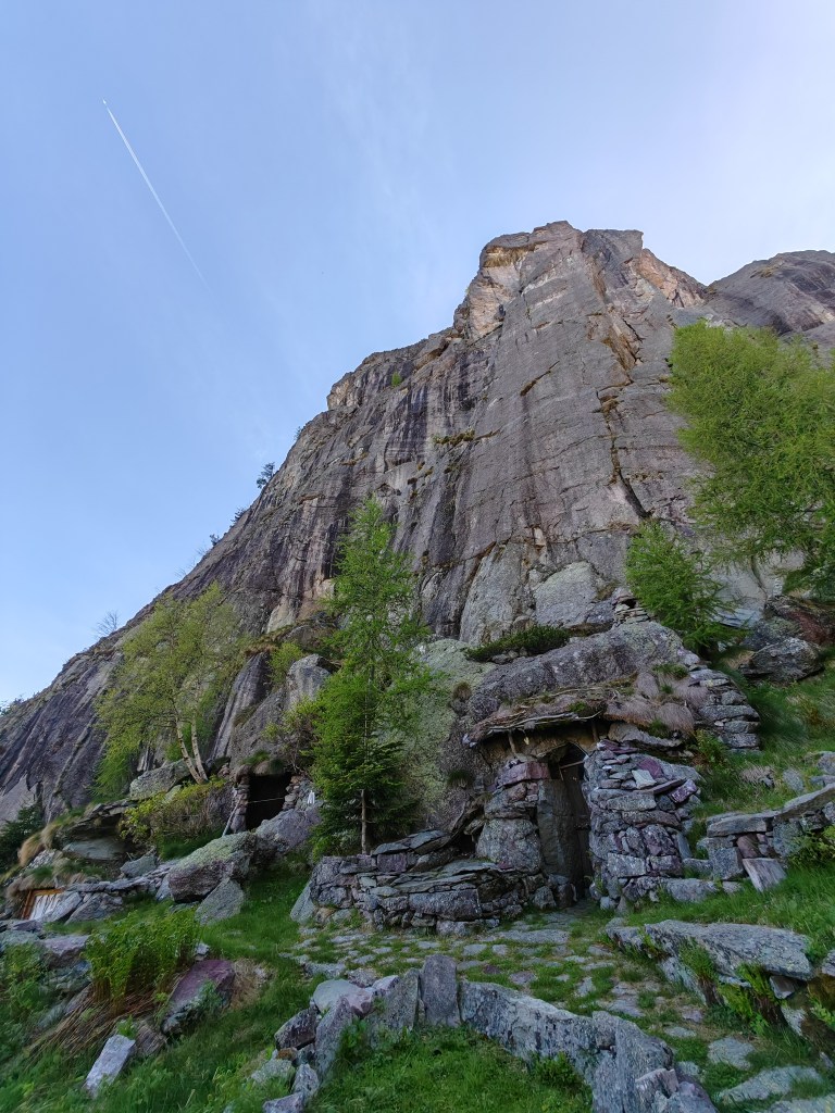 Attacco: Da Gandellino (Bg) proseguire sulla strada che sale fino alla frazione di Tezzi Alti dove si parcheggia in fondo alla strada asfaltata dove inizia un tratto sterrato. Proseguire brevemente per strada sterrata e appena prima dell’agriturismo prendere un ripido sentierino a scalini di roccia sulla destra. Dopo poco si sbuca su un’altra sterrata nei pressi di una baita, si prosegue a sinistra sulla sterrata fino a un orso intagliato nel legno. Qui si continua destra nel prato superando un paio di baite e contornando il prato fino a quando il sentiero non entra nel bosco. A un primo bivio si tiene da sinistra e si prosegue nel bosco lungamente per sentiero a tratti abbastanza ripido (seguire sempre il sentiero più tracciato non farsi tentare da omini o altre tracce). Si continua per il sentiero fino a un corda fissa e poco dopo a un cartello in legno con le indicazioni per la Val Famada. Si continua ora su ghiaione e poi su sentiero che si infila nei mughi. A questo punto la struttura è ormai ben visibile e si prosegue fino alla sua base dove è presente un bivacco/abitazione dove un tempo abitava un eremita. [1:30 h]