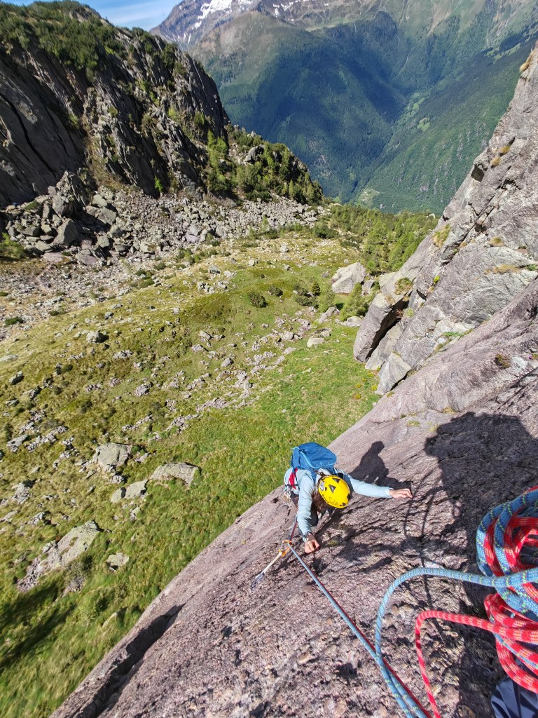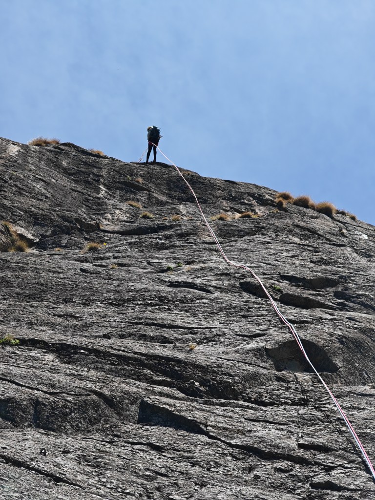 - Si prosegue per facile placchetta appoggiata che porta sulla sommità della struttura e alla sosta su due fix. [5b, 25m]