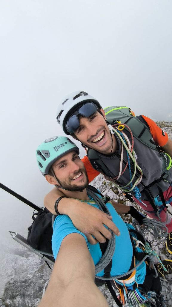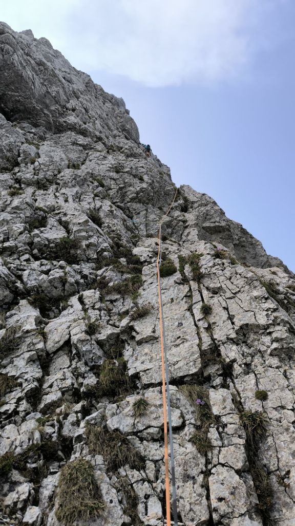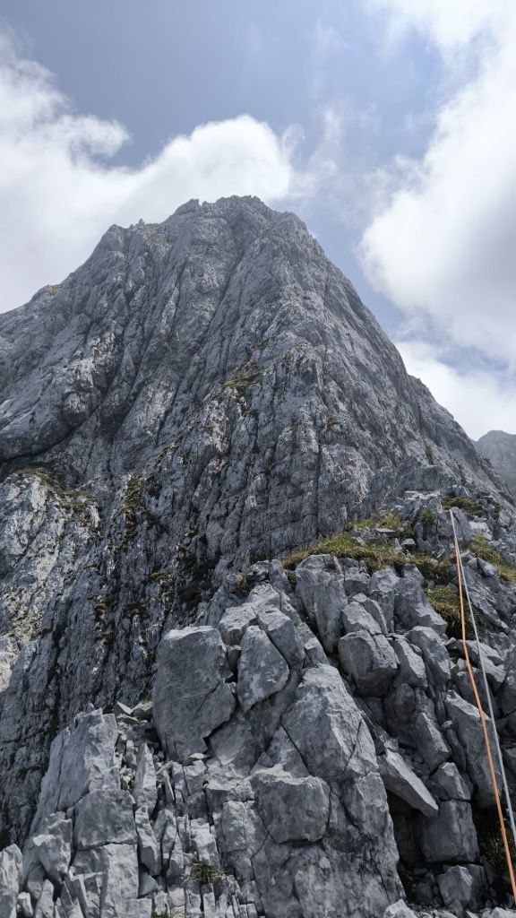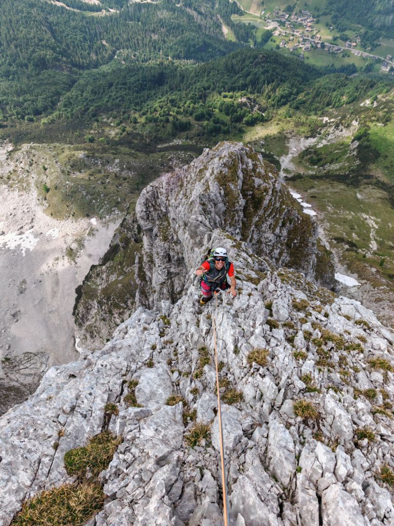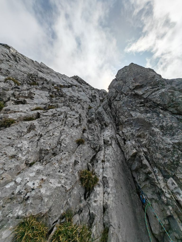 - Percorrere l’affilata cresta facendo attenzione alla roccia e affrontare un risalto più ripido sul filo per poi dopo qualche metro spostarsi a sinistra e proseguire su una zona più appoggiata della parete. Qui non è facile individuare un buon posto dove costruire una sosta, io ho piantato un chiodo e messo un friend grosso (n°3 BD) in una fessura qualche metro a sinistra del filo dello spigolo. In ogni caso non allontanarsi troppo dallo spigolo in quanto il tiro successivo affronta la cresta direttamente sul suo filo. [III, 55m]