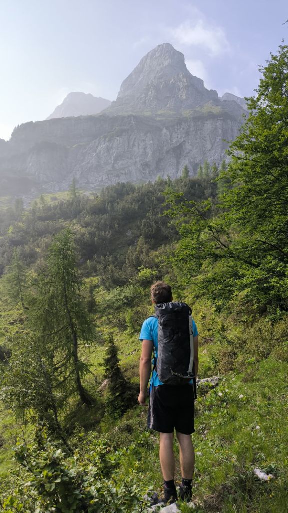 Dalla vetta scendere brevemente per facile cresta (lato opposto alla salita) fino a una evidente depressione nella cresta. Qui non continuare sulla cresta ma abbassarsi a sinistra (Est) per ripidi prati in diagonale puntando al ghiaione sottostante.