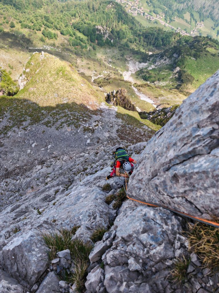 - Spostarsi un paio di metri a destra restando poco a sinistra del filo fino alla base di un risalto verticale. Aggirarlo a destra dello spigolo per poi riprendere il filo dello spigolo sfruttando dei buon appigli sul lato destro dello stesso (tratto da intuire). Continuare sullo spigolo fino alla base di una placchetta dove si sosta su spuntone + chiodo (da mettere). [IV, 30m]