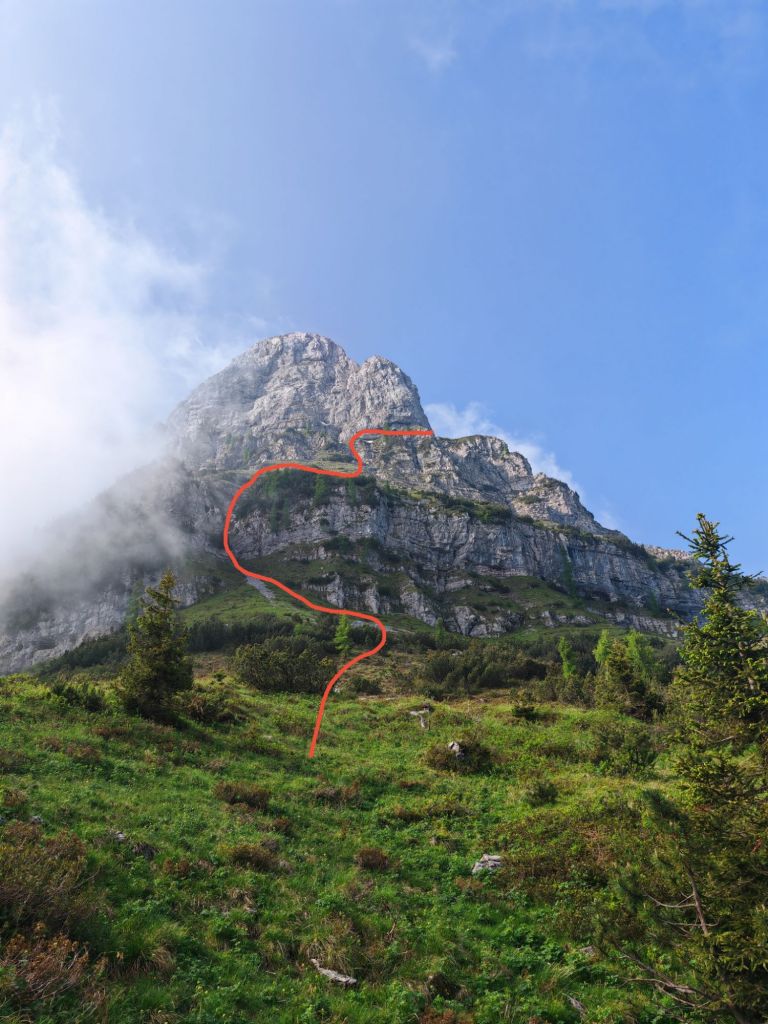 Attacco: Dal Parcheggio in fondo a Valcanale (Bg) dirigersi verso l’inizio del sentiero che porta al Rifugio Alpecorte ma invece di proseguire per la mulattiera che porta al Rifugio svoltare a sinistra (sbarra) a proseguire per strada asfalata fino a un vecchio Albergo abbandonato. Continuare per strada sterrata sempre più ripida che porta dopo un po’ ad una baita (Baita di Vaghetto bassa). Alla baita proseguire per sterrata a sinistra fino ad una seconda baita (Vaghetto alta). Qui si passa davanti alla baita (abbandonando la traccia del sentiero) e si prosegue sempre per sterrata che in leggera discesa porta ad un ampio pratone. Qui si deve reperire una traccia dal lato opposto del prato (verso destra faccia a valle) che scende nel bosco. Poco dopo la traccia porta ad un enorme ghiaione/canalone. Individuare una traccia dall’altra parte del ghiaione e seguirla lungamente nel bosco superando un vecchio abbeveratoio di cemento e infine, uscendo dal bosco, si arriva sotto una grossa barra rocciosa che blocca l’accesso ai prati superiori posti sotto la Corna. Evitare la barra rocciosa a sinistra (sentiero) e poi per prati puntare a un secondo salto che nuovamente si aggira leggermente a sinistra infilandosi in un canalino verticale che si supera fino ai prati superiori (tratti di arrampicata molto facile ma esposta). Ora proseguire per prati ripidi puntando a un evidente canale detritico (leggermente a destra) che permette di superare un ultimo salto per reperire la cengia che porta all’attacco. Percorrere la cengia verso destra (salendo) e pochi metri a destra di un strapiombo si trova l’attacco.[3h, terreno a volte esposto e avvicinamento non sempre facile da intuire]