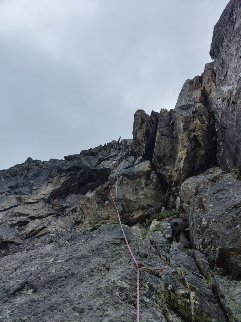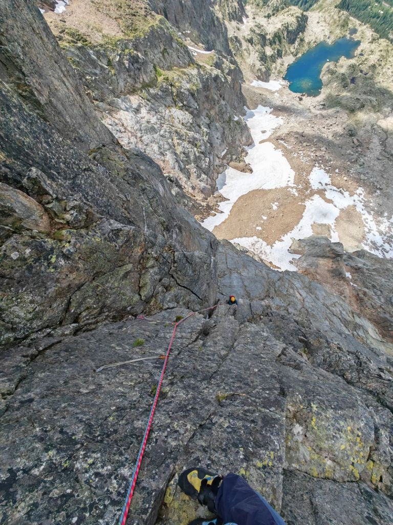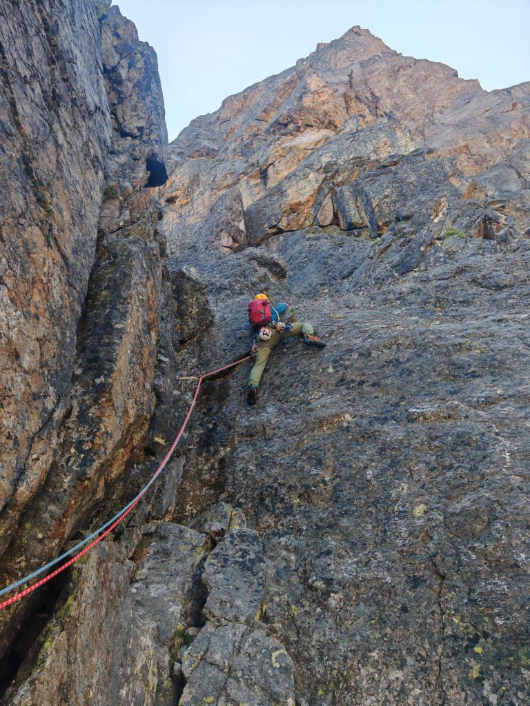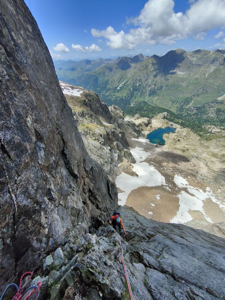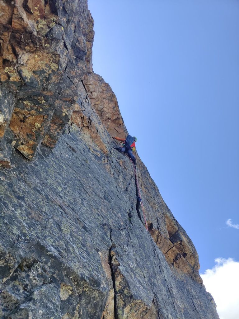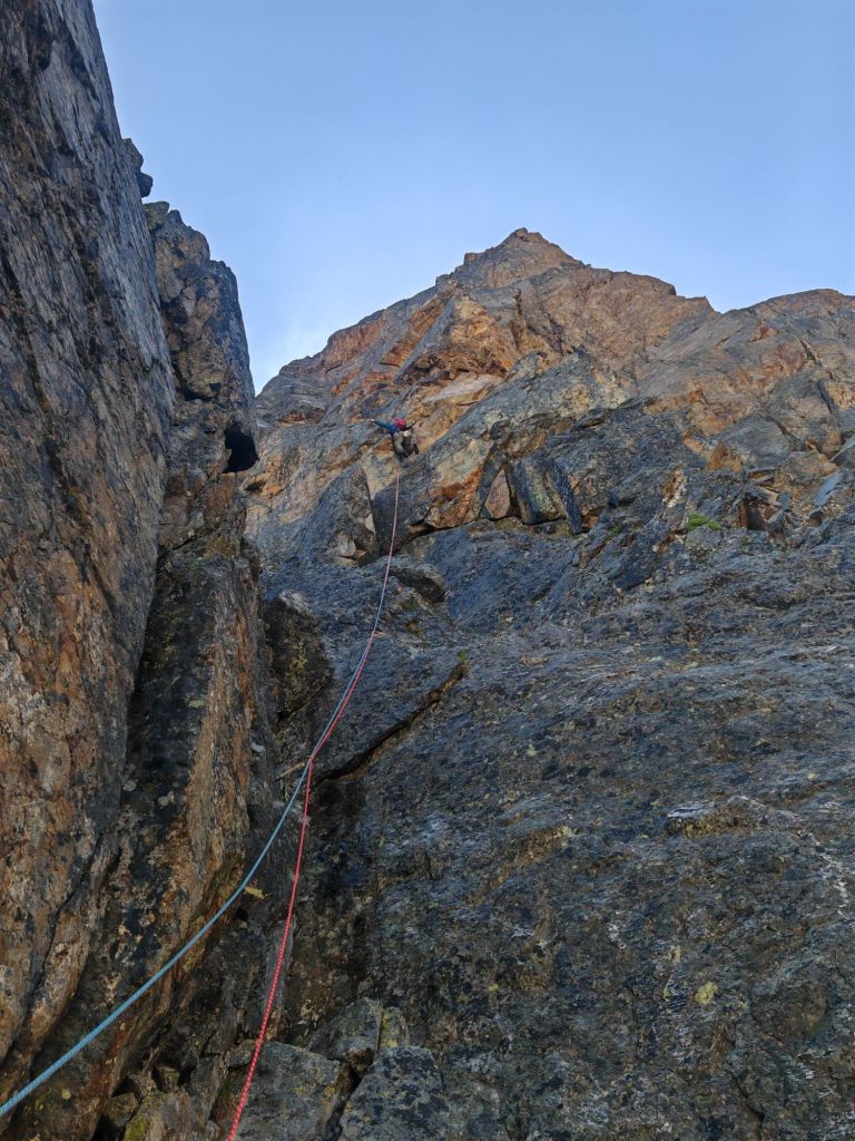 Questa è la quarta via che salgo su questa parete e come era già successo con le altre ha saputo stupirmi con qualche sorpresa. La salita è abbastanza logica con arrampicata varia e divertente. Particolarmente degno di nota il terzo tiro con una sezione ad incastro in fessura, una vera rarità nelle Orobie, sicuramente da fare! Sul pdf “Arrampicate nella Conca del Calvi” della scuola CAI Pelliccioli questo tiro è segnato come VI e A1, noi lo abbiamo scalato interamente e le difficoltà ci sembrano intorno al VII.