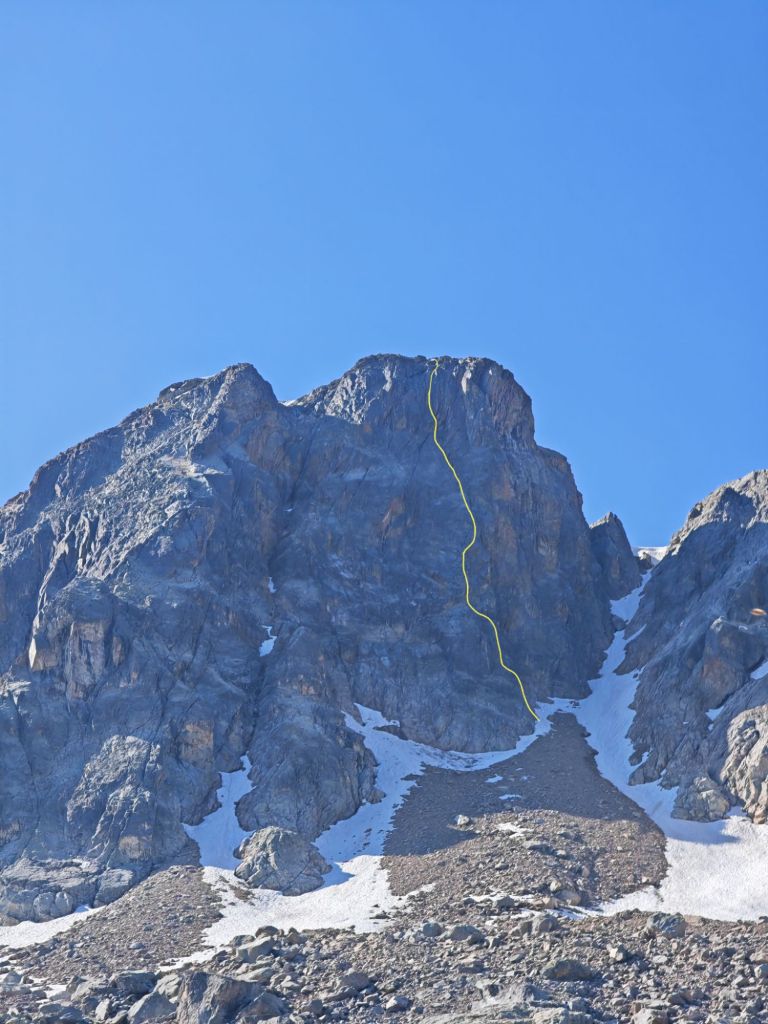 - Entrare nel diedrino a destra e salirlo fino a quando si esce su terreno molto semplice e appoggiato che conduce sulla cresta sommitale nei pressi della vetta. [IV, 45m]