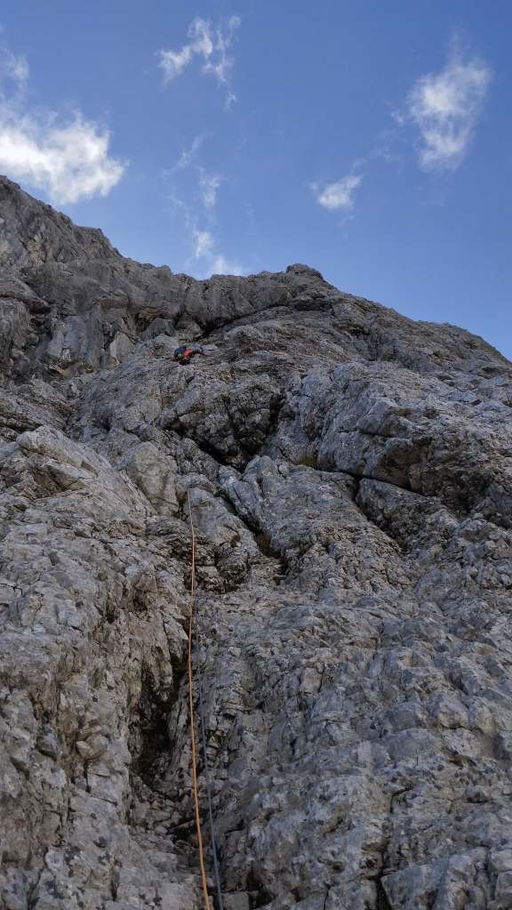 - Spostarsi a destra un paio di metri per poi salire un po’ dritti e poi leggermente verso sinistra fino ad attrezzare una sosta su un terrazzino. [V, 50m]