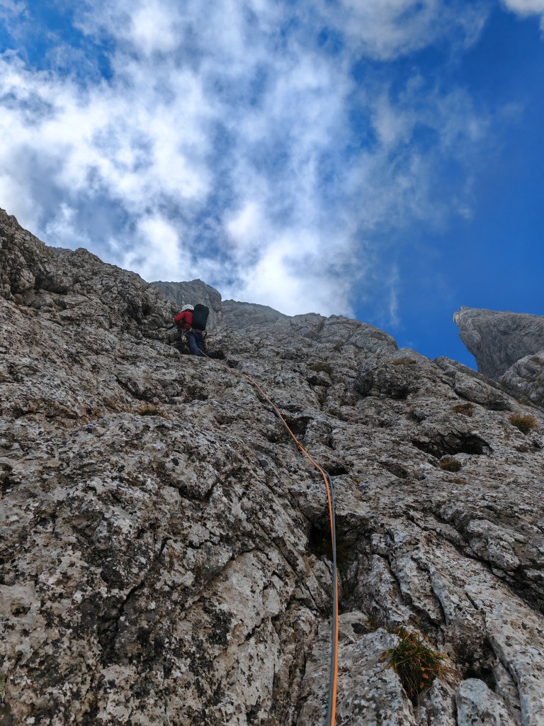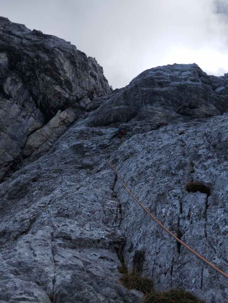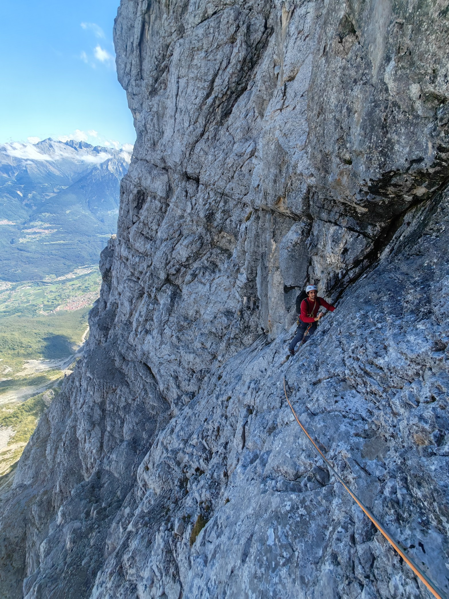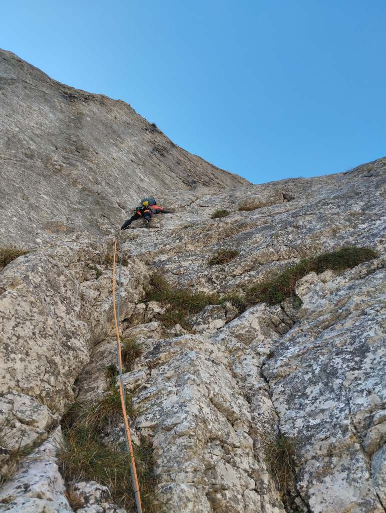 - Scalare la placca sopra la sosta fino a quando il terreno non diventa sempre più facile, spostarsi leggermente verso sinistra fino ad attrezzare una sosta leggermente a sinistra di un grosso anfiteatro (dovrebbe esserci un chiodo di sosta che però non abbiamo trovato). [IV, 55m]