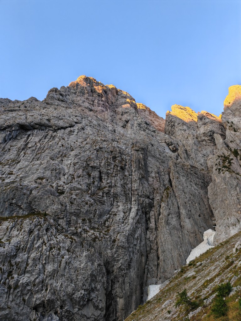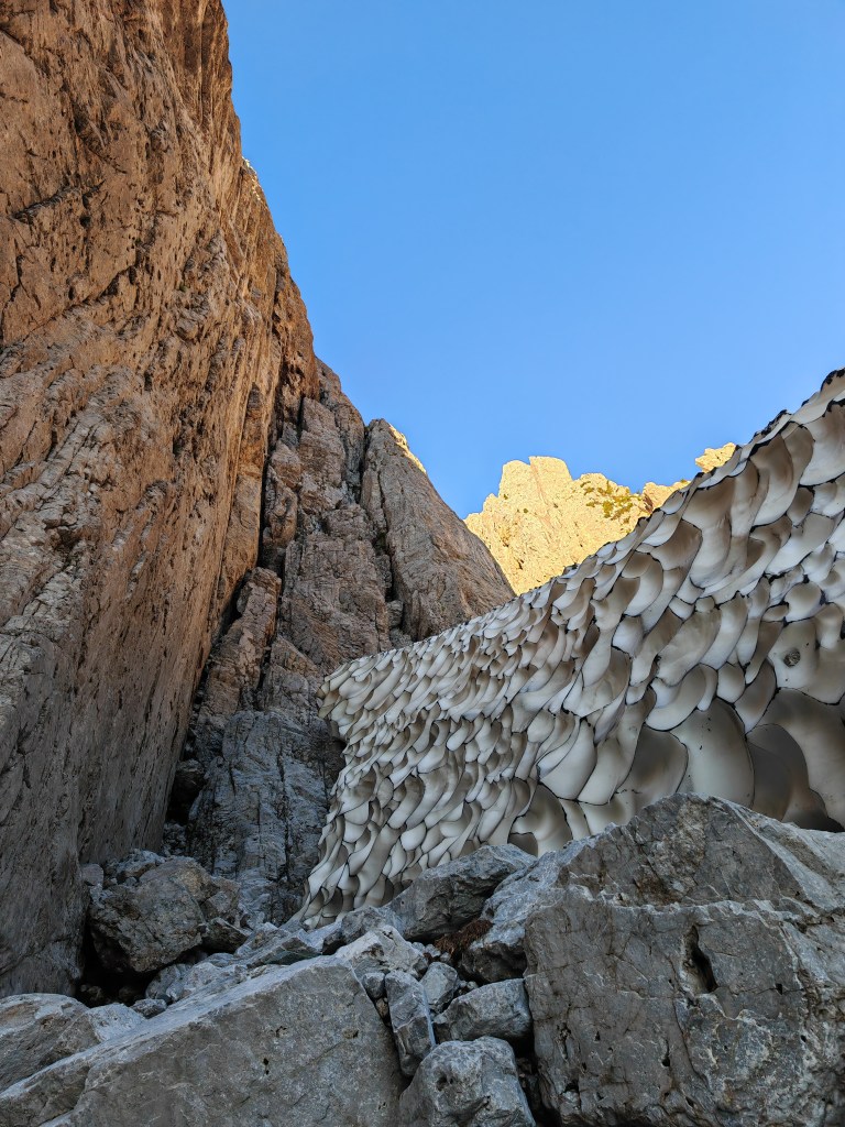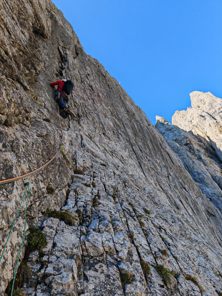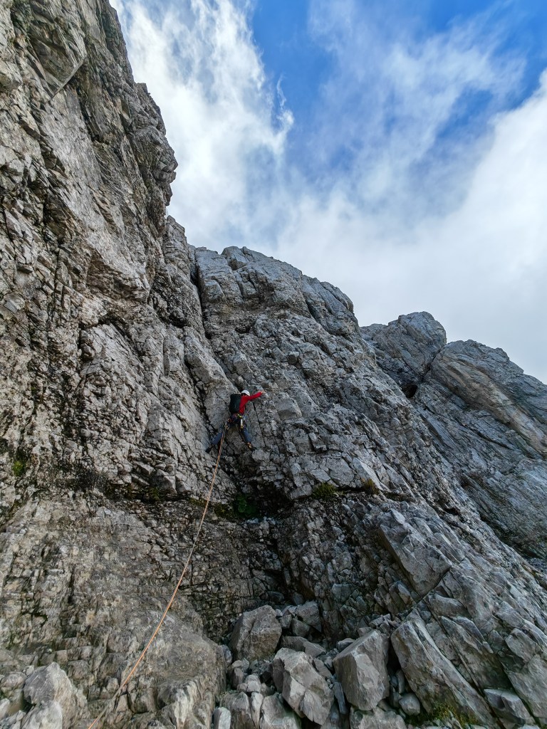 - Scalare la placca sopra la sosta fino a quando il terreno non diventa sempre più facile, spostarsi leggermente verso sinistra fino ad attrezzare una sosta leggermente a sinistra di un grosso anfiteatro (dovrebbe esserci un chiodo di sosta che però non abbiamo trovato). [IV, 55m]