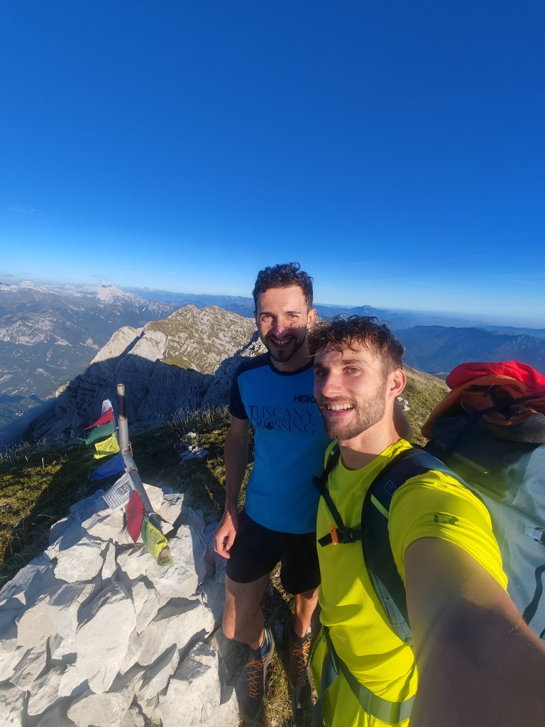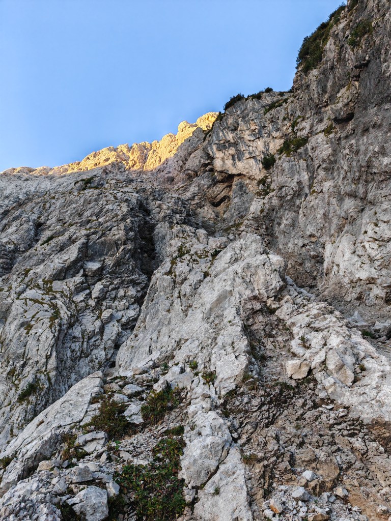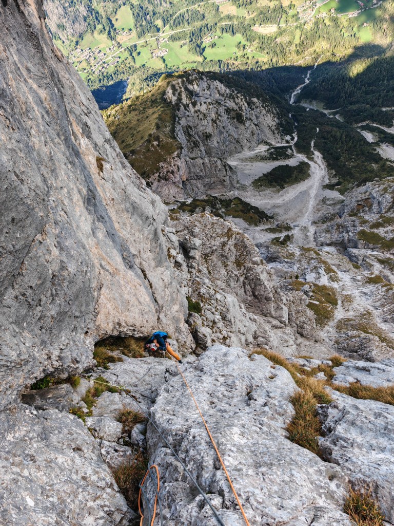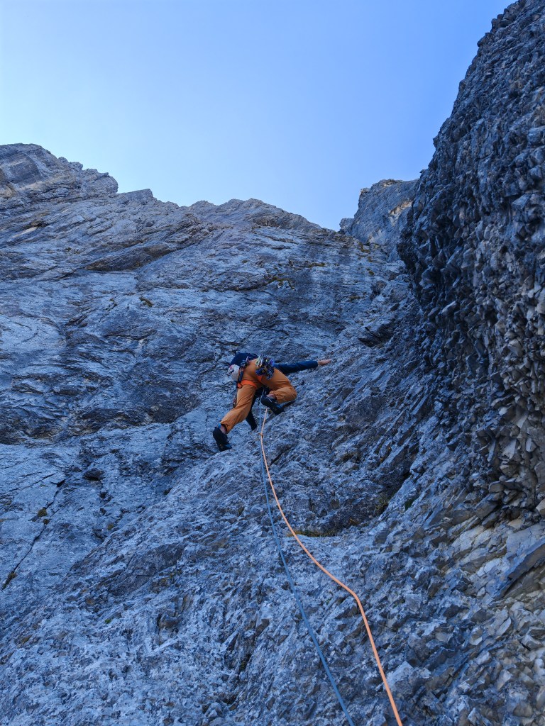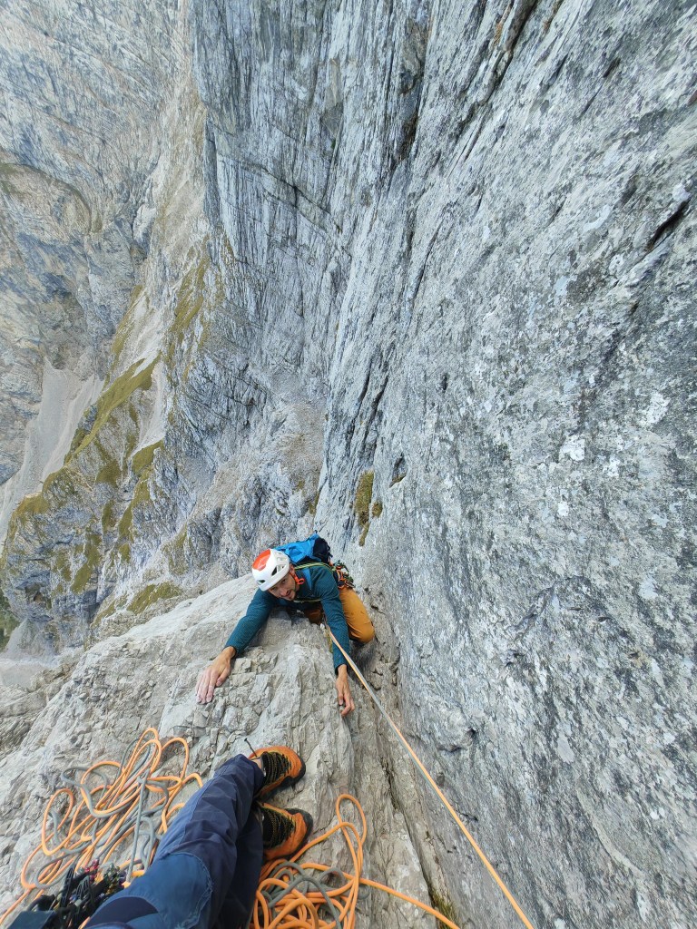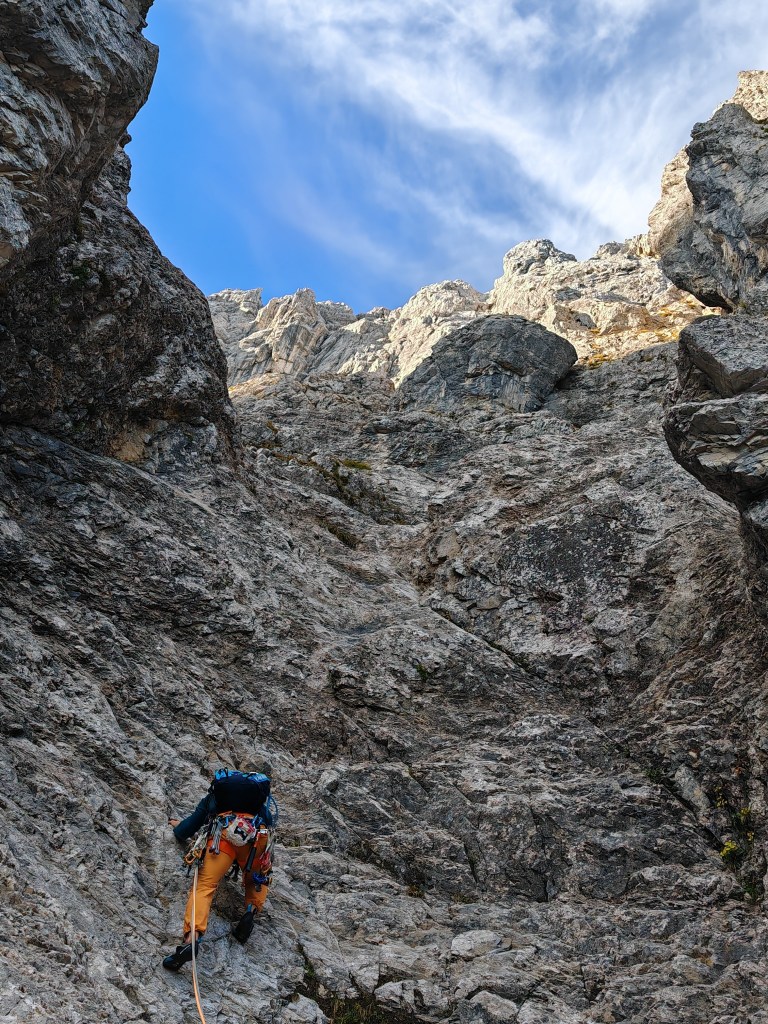 - Qui abbiamo nuovamente unito più tiri arrivando direttamente in cima con circa 120 metri e difficoltà massime di IV. In ogni caso qui il terreno non è obbligato noi abbiamo seguito una serie di diedrini verso sinistra fino ad uscire su terreno erboso e immetterci in un canale/camino di roccia delicata che porta fino alla cresta sommitale.